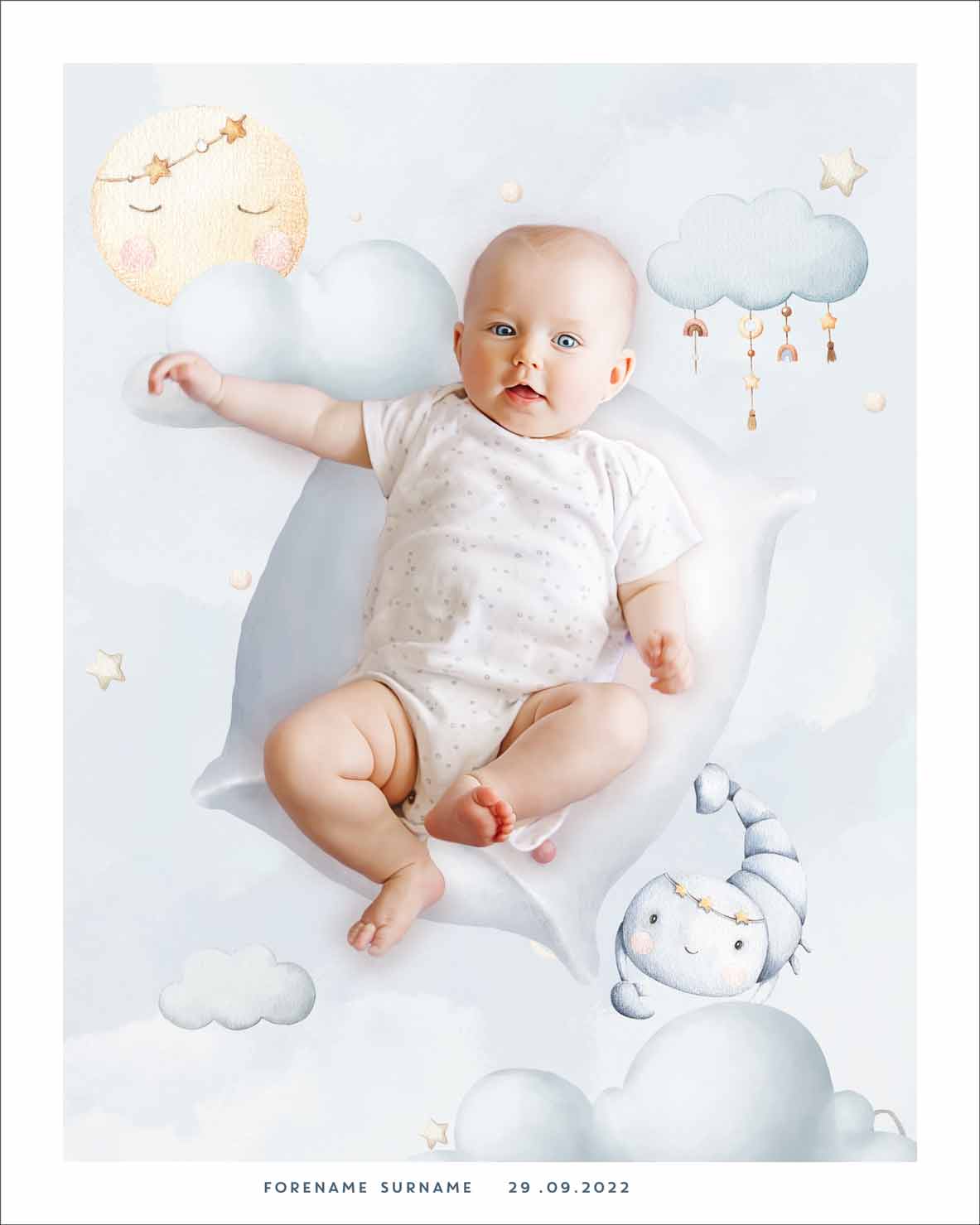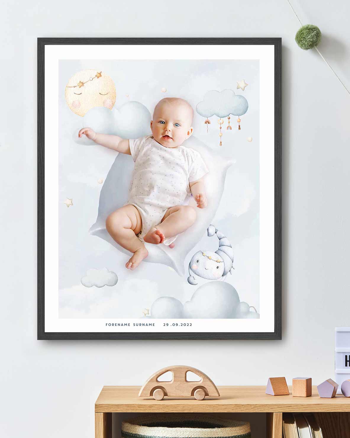 Tilpass med eget navn, fødselsdato og bilde av barnet.