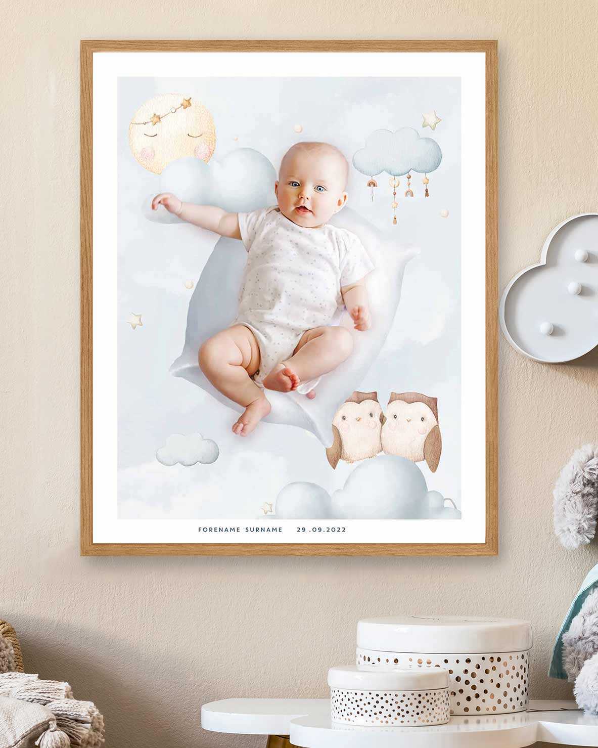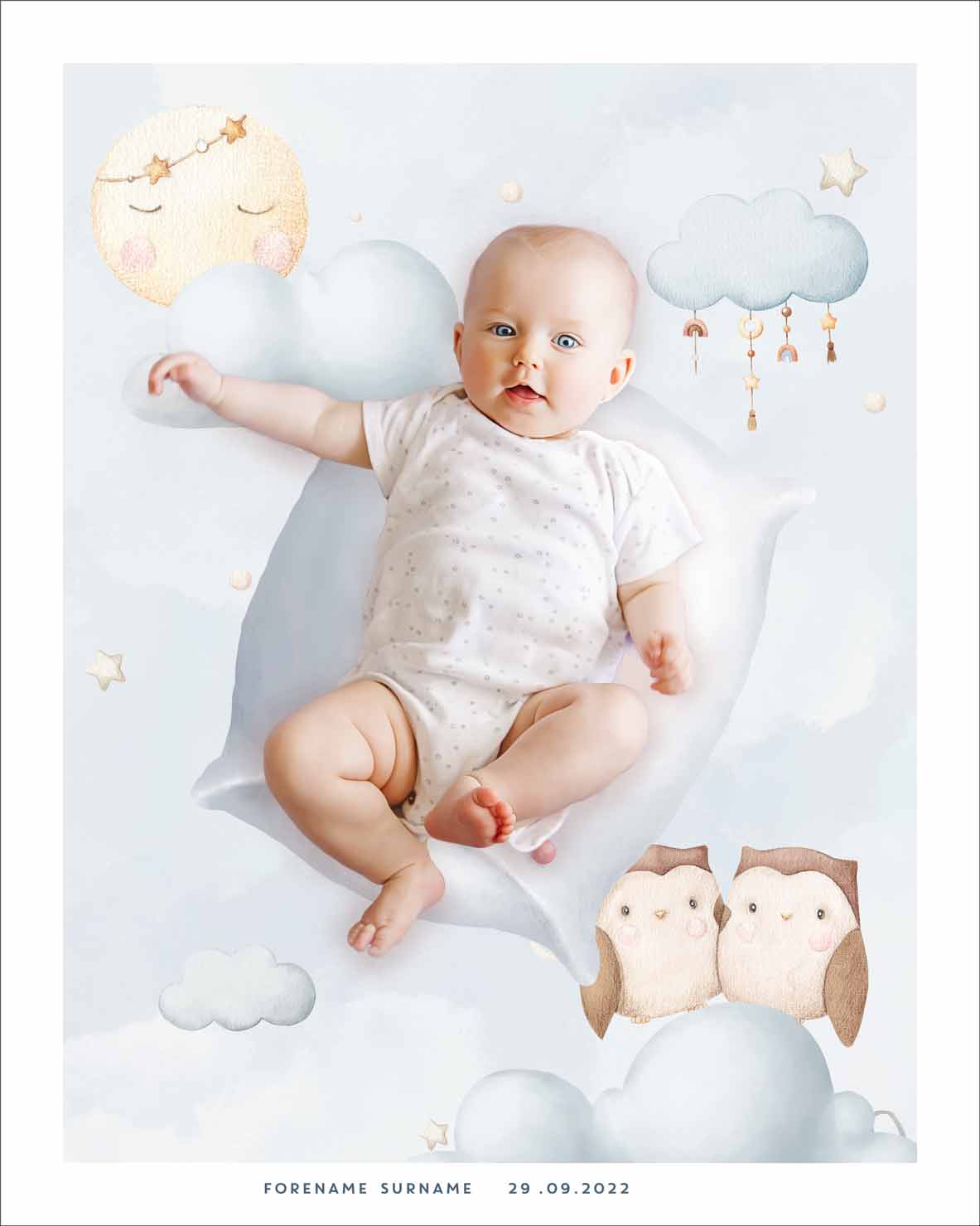 Tilpass med eget navn, fødselsdato og bilde av barnet.