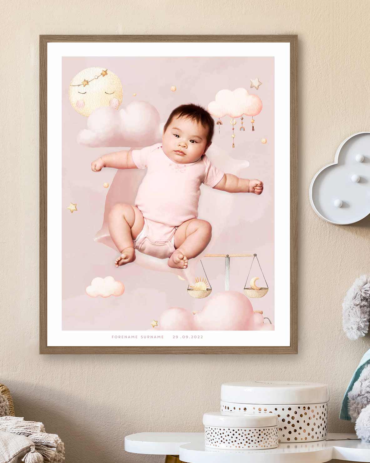 Tilpass med eget navn, fødselsdato og bilde av barnet.