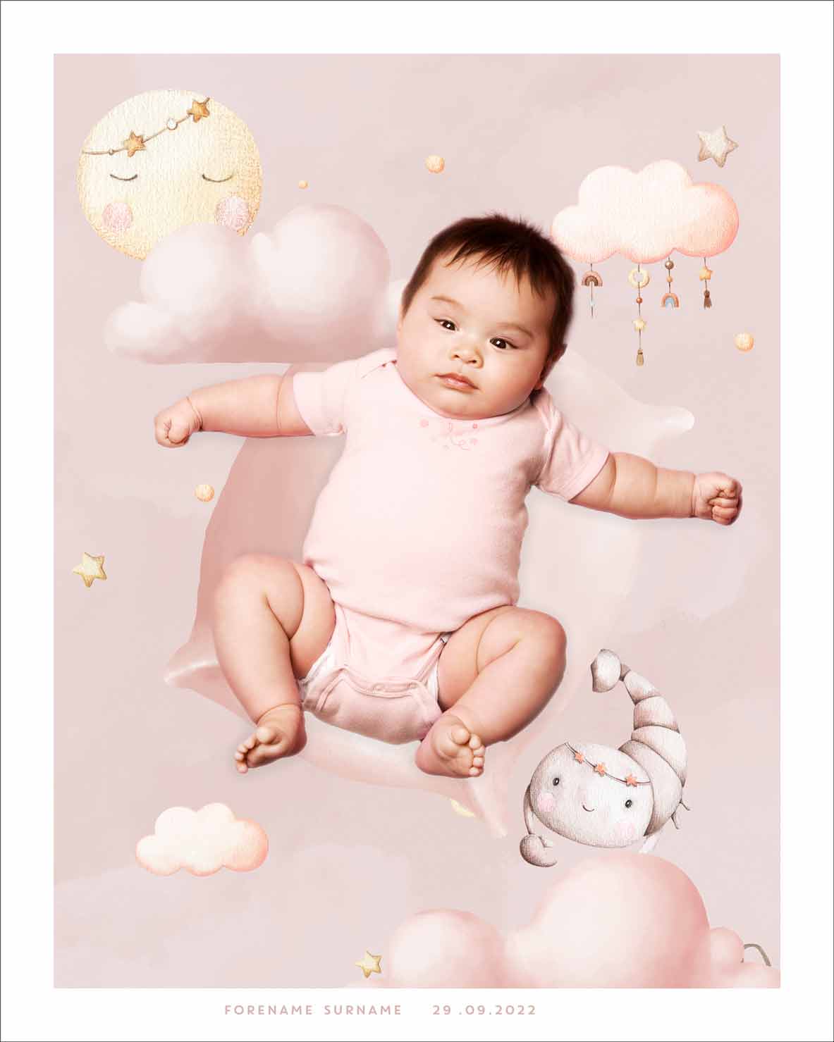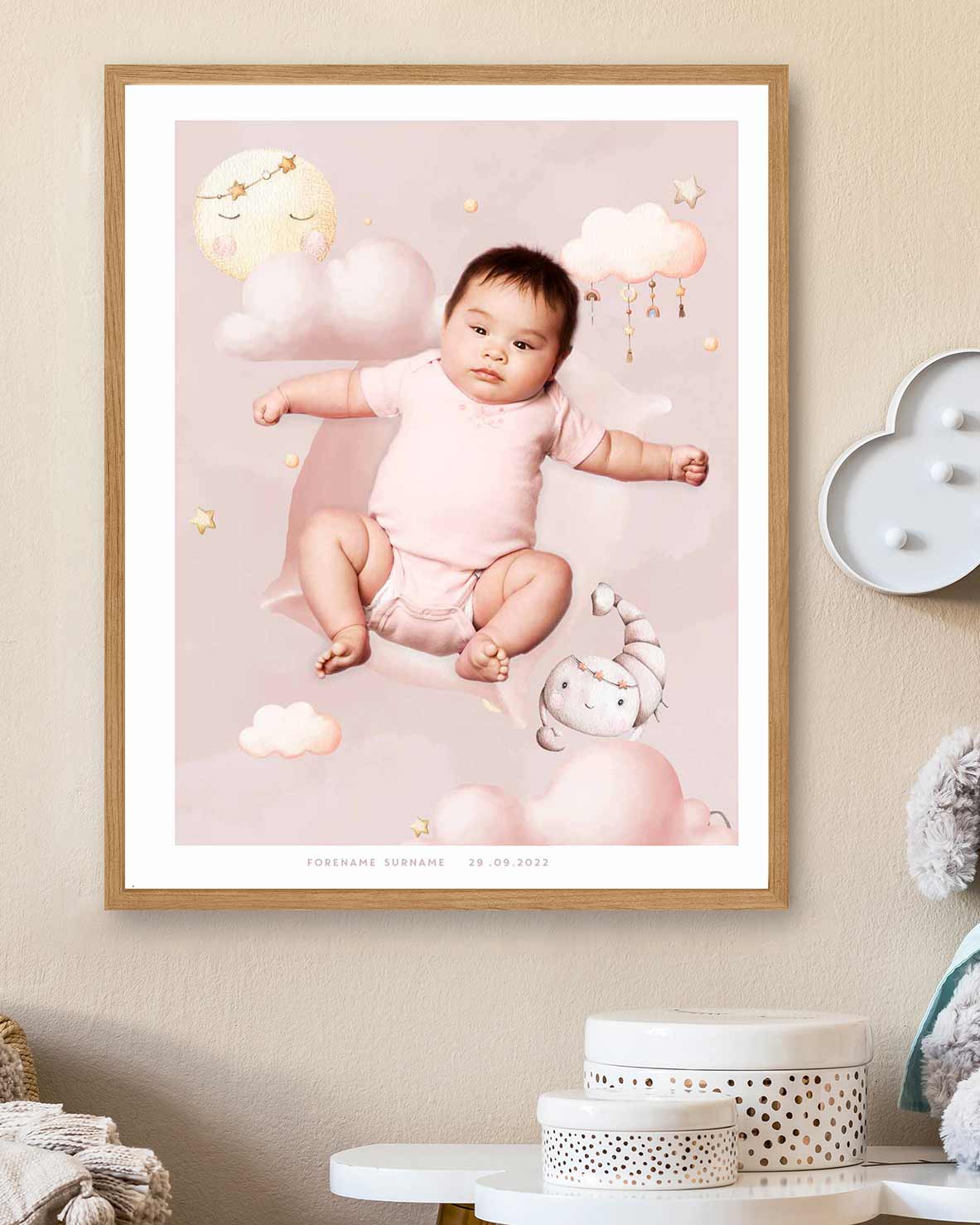Tilpass med eget navn, fødselsdato og bilde av barnet.