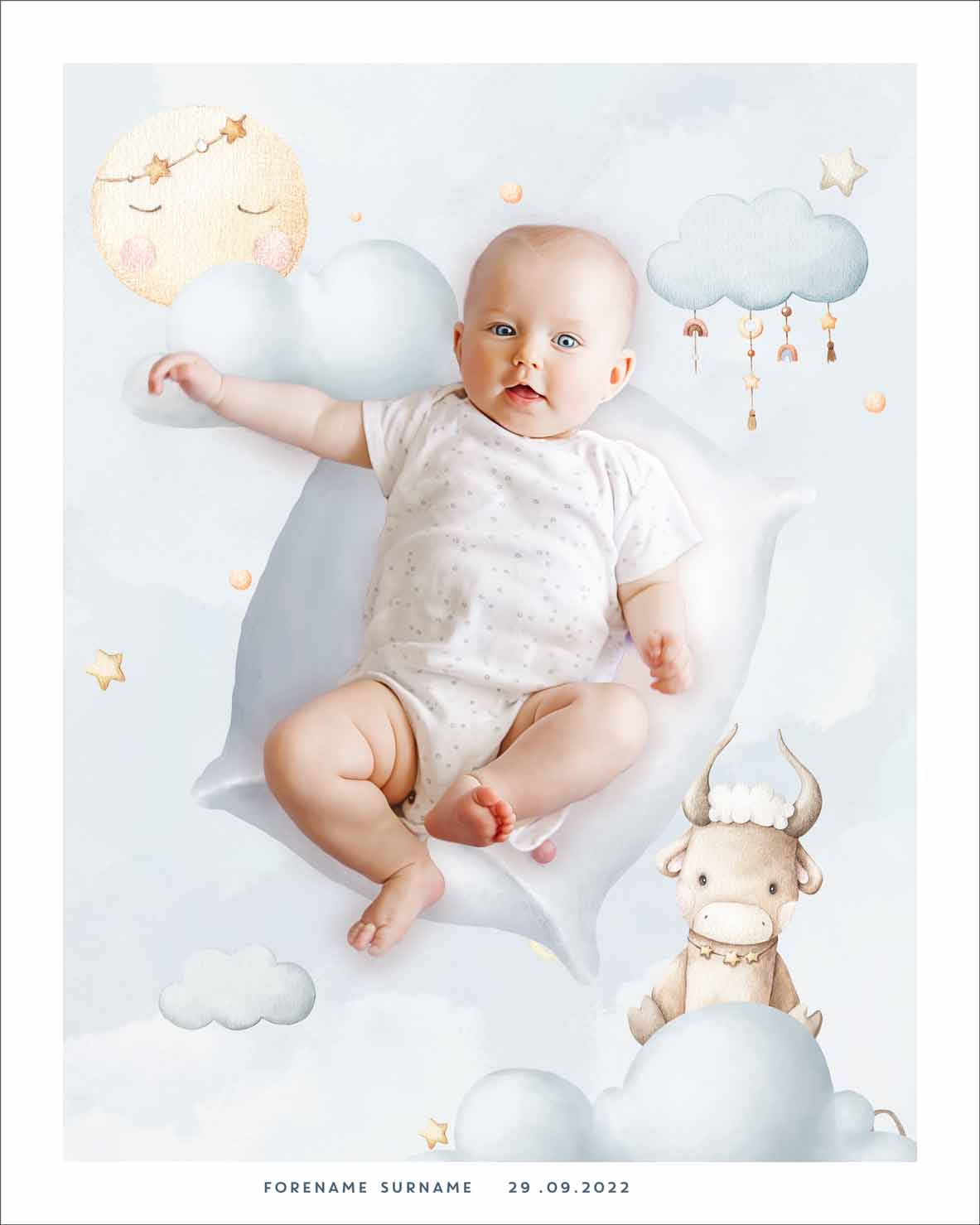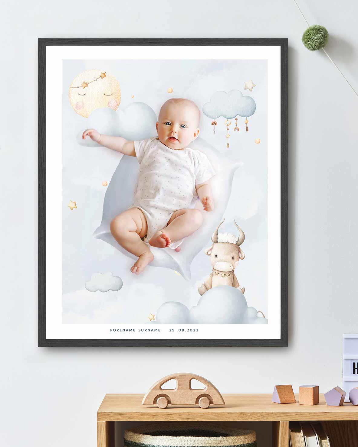 Tilpass med eget navn, fødselsdato og bilde av barnet.